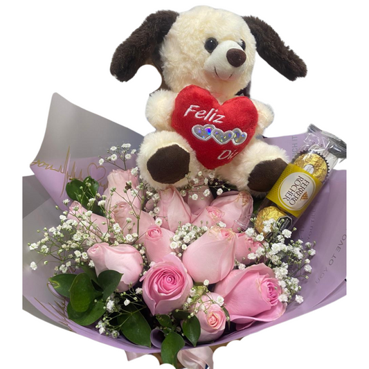 Ramo de Cumpleaños Combo Rosas Rosadas Ferrero Rocher x3 y Peluche
