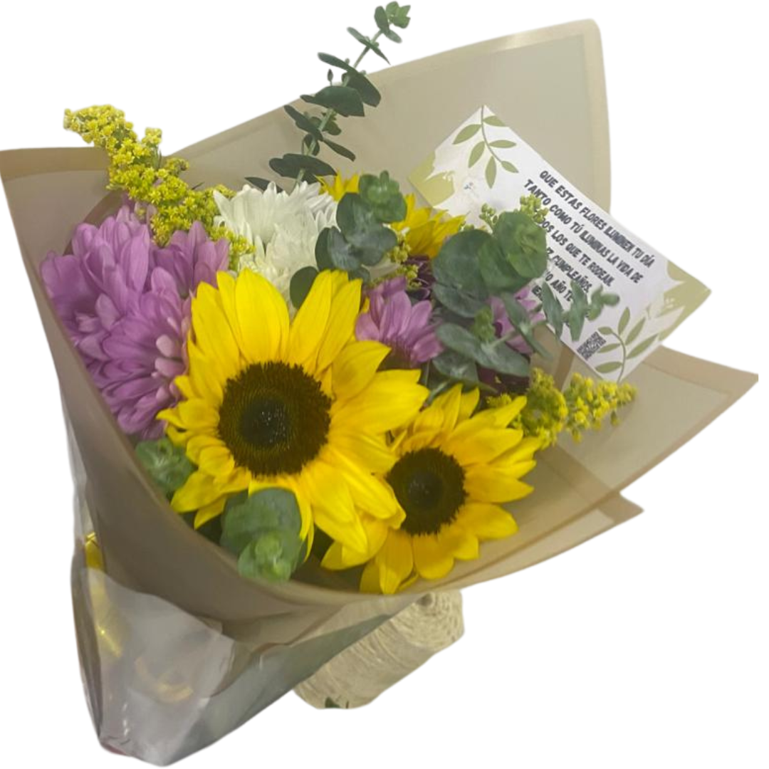 Un ramo vibrante y lleno de energía, donde los girasoles brillan con su calidez, acompañados de margaritas blancas que aportan frescura y delicadeza. El toque dorado del solidago y el aroma suave del eucalipto completan esta mezcla, creando un arreglo lleno de vida y frescura natural. Perfecto para transmitir alegría y frescura en cualquier momento especial.